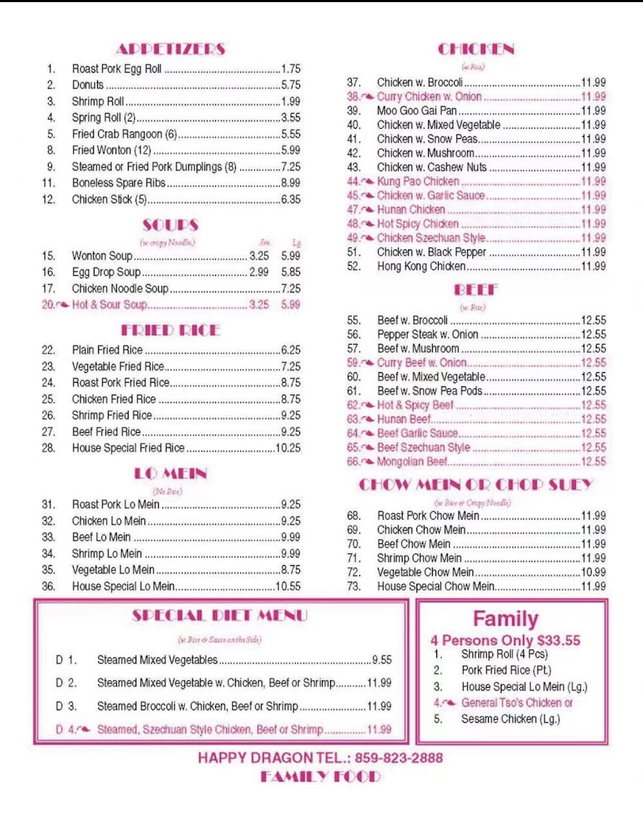 Welcome to Happy Dragon, a beloved culinary gem nestled in Dry Ridge, Kentucky. This charming restaurant offers a delightful array of Chinese cuisine that caters to various palates. From the moment you step inside, the friendly atmosphere greets you, making it a cozy spot for families and friends alike.